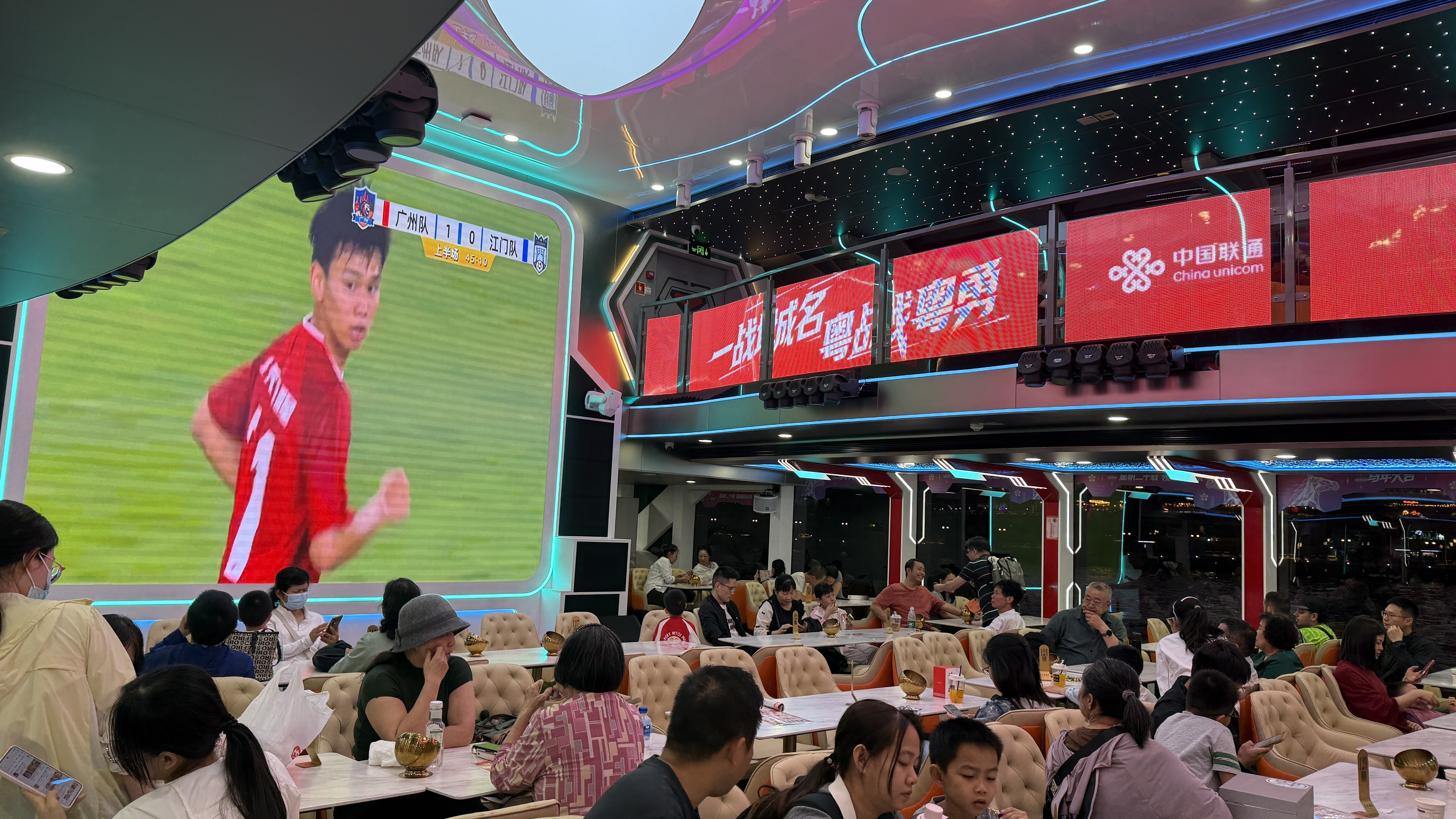 4月25日晚,粤超揭幕战火热打响。天字码头“星舰领航·全运号”游船上,320名球迷吹着江风看进球!超大LED巨幕直播,两岸夜景与绿茵激战同框。呐喊声中,整条珠江都在为足球狂欢!