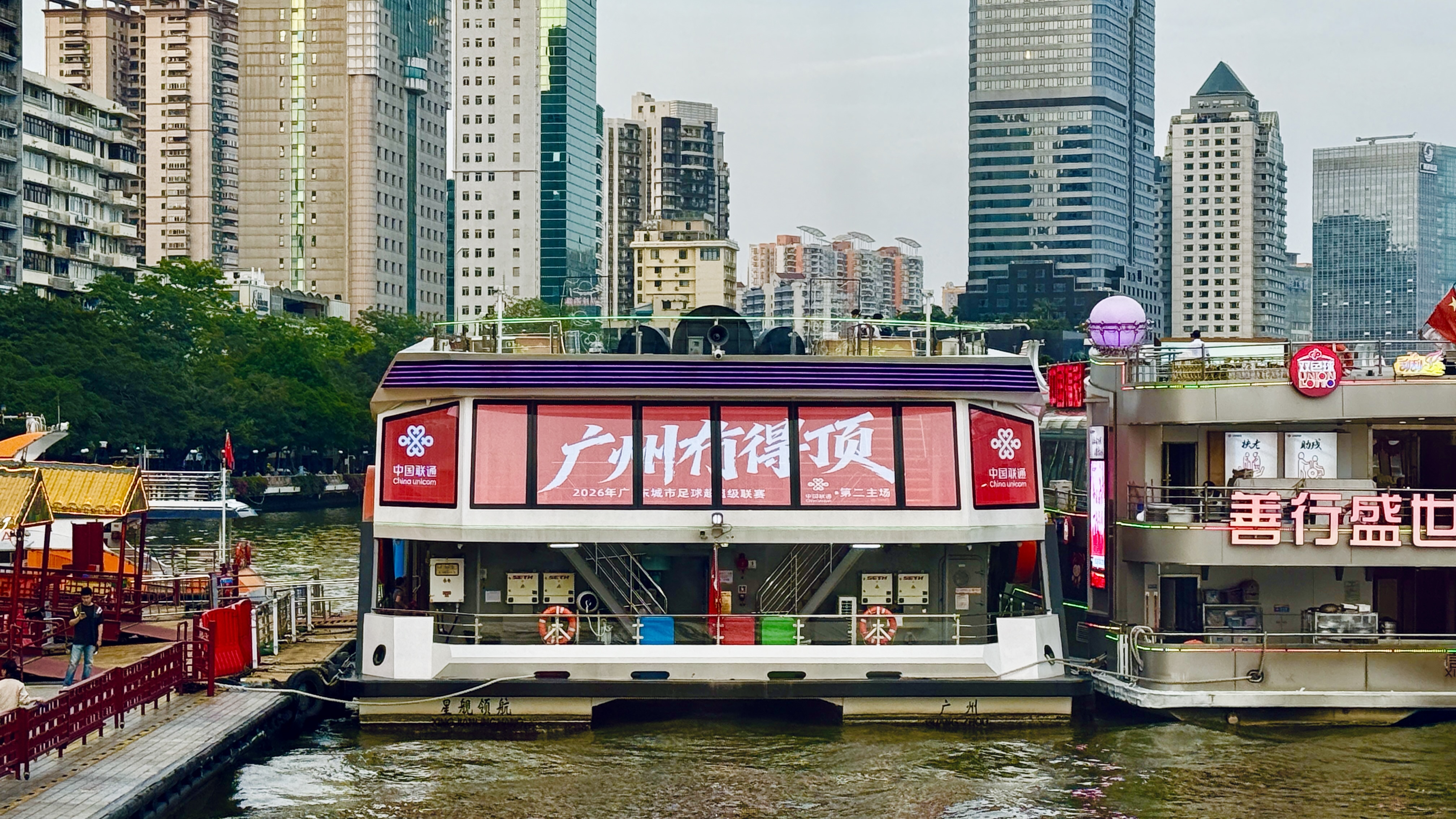 “以往主赛场座位有限,很多球迷抢不到票只能看手机直播。今年我们特意把‘第二现场’搬到水上,让更多市民能近距离感受赛事魅力。整船有超过100平方米的LED屏,今晚大家看球的屏幕超过17平方米。”客轮公司广州之星营销总监黄浩安在现场向记者介绍,天字码头全力支持粤超赛事,“所有广州主场的比赛都会在这里全程直播”。他特别提到,为回馈球迷热情,客队观众凭有效证件可享游船专属购票优惠,而所有参赛球员均可免费登船观赛。